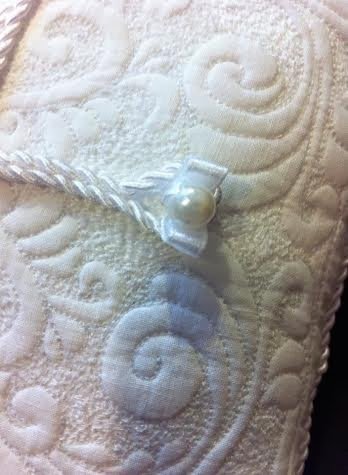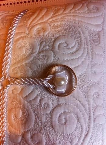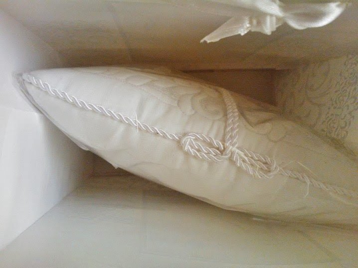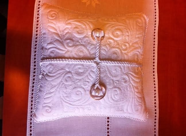 Az alapanyag fehér pamutvászon,a mintája gépi tűzéssel készült,az alapból szép plasztikusan emelkedik ki a sűrű tűsatírnak és a gyapjú közbélésnek köszönhetően, a fő motívum. A felirat, amin a jegyespár neve, és a kézfogó dátuma szerepel, a párna hátuljára van ezüst színű gépi hímzéssel kivarrva. / Erről, babonából majd akkor teszek fel képet, ha az esemény már megtörtént. /
