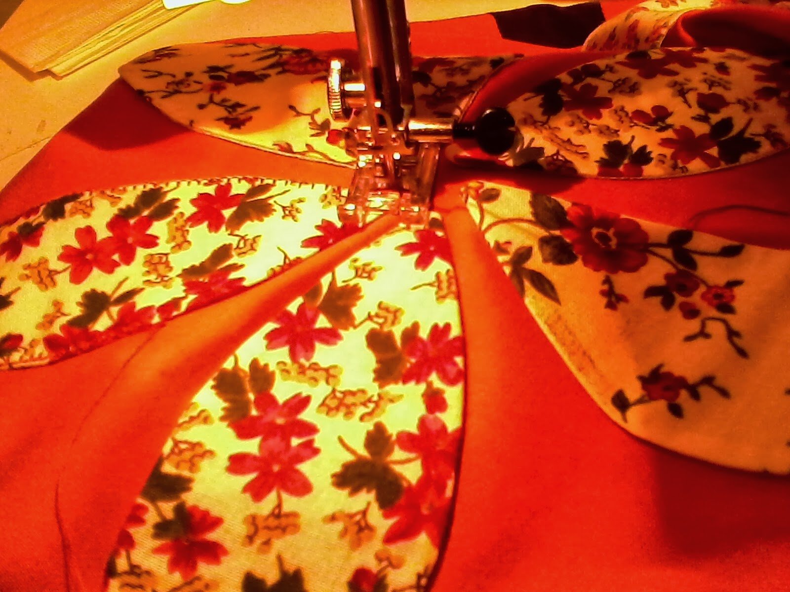 Mivel a papír benne maradt, és a világos szirmok sötétebb alapra kerültek, így könnyedén ki lehetett a sötétebb textilt vágni a világosabb mögül, hogy ne zavarja az összhatást.Mint látható először gépi hímzőöltéssel körbeszegtem, aztán vágtam ki ügyelve a varrás épségére.