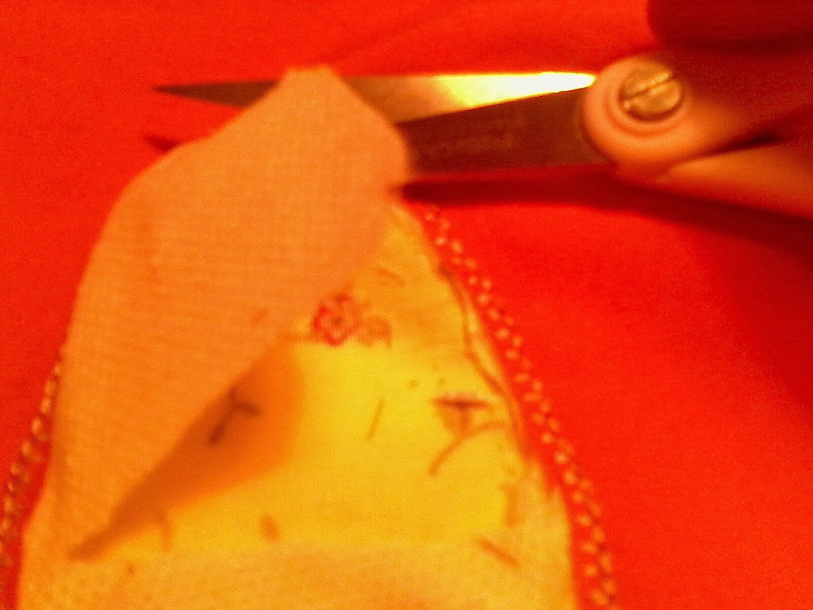 /Az anyag színét kell szembefordítani a vetex ragasztós felével, majd keskeny varrásszélességet hagyva egyenletesen körbevágni. Ha ez kész , a vetexen apró bemetszést ejtve fogjuk tudni kifordítani. Így kerül a ragasztós fele abba a pozícióba, hogy fel lehet vasalni a helyére./