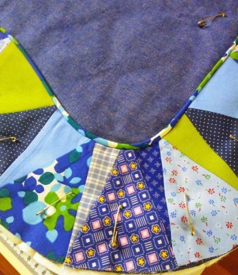 Az ívelt forma kialakítása papírra varrva könnyebben ment, mint gondoltam. Miután a formája kialakult hátulról ragasztós vászonnal erősítettem meg. A farmer anyag és a bordűr közé természetesen kéder is került, egy nagy mintás anyagból, hogy szép színes legyen.
