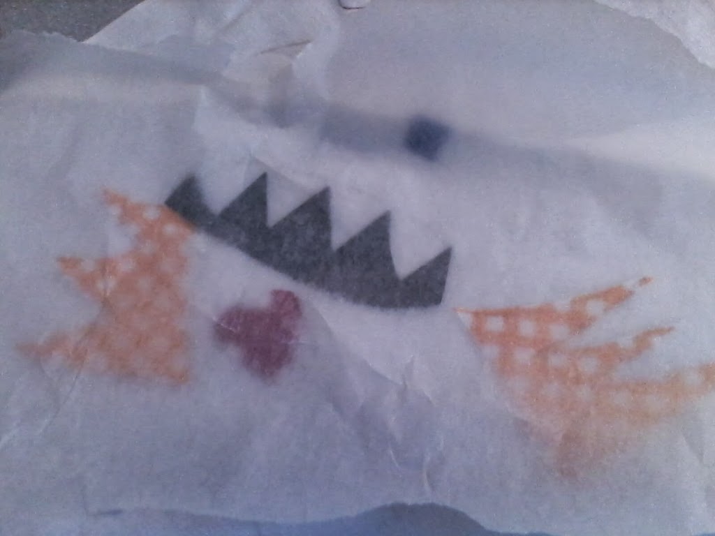 A fóliára ugyancsak átmásoljuk a mintát, a fóliát fogjuk rátenni az alapra, és csipesszel szépen aládugdossuk az apró részeket, így minden a helyére kerül.Ha kész, óvatosan leemeljük a fóliát és sütőpapíron keresztül átvasalva rögzítjük a ragasztást.