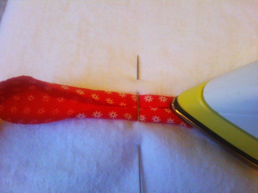 két szélét egymással szembe hajtjuk.Innen már egyszerűen csak folyamatosan, lassan húzzuk át az egyik oldalról a másikra a pántot, miközben vasalással rögzítjük a hajtásait.