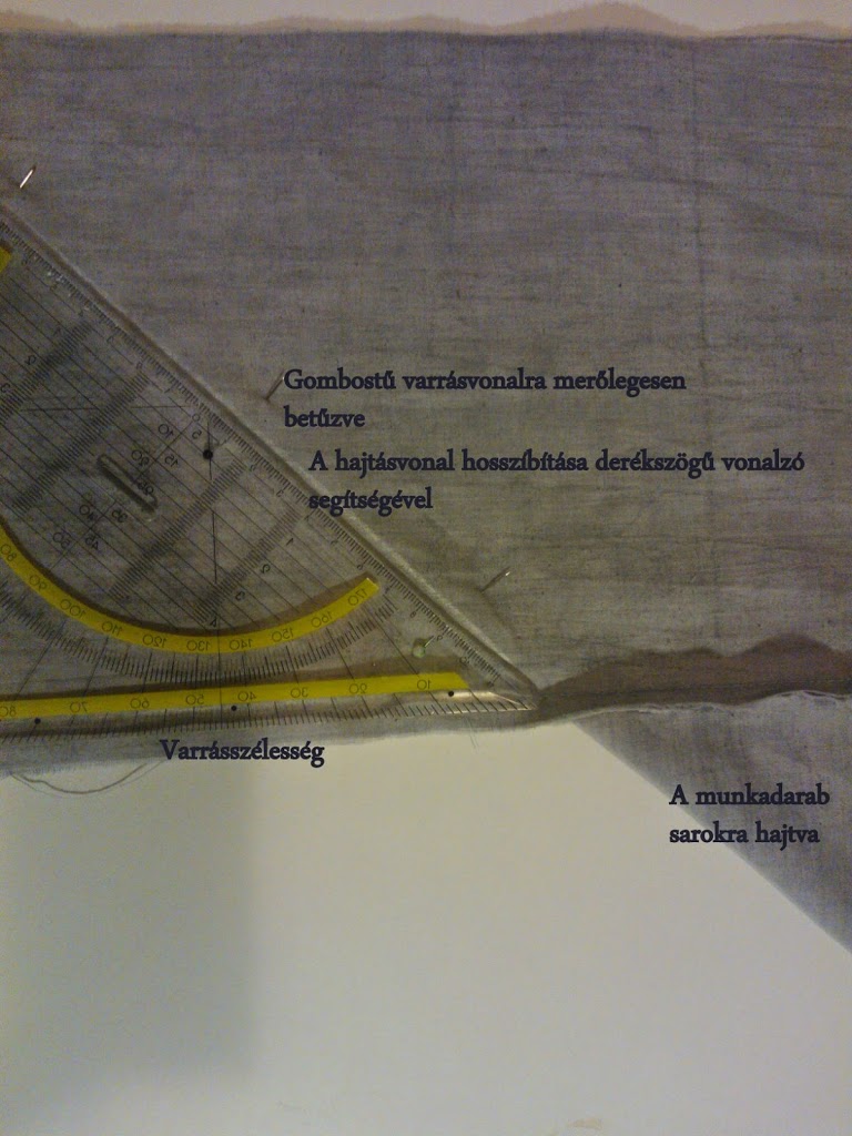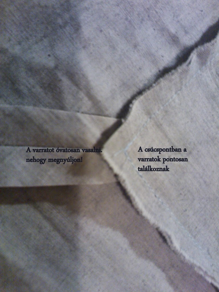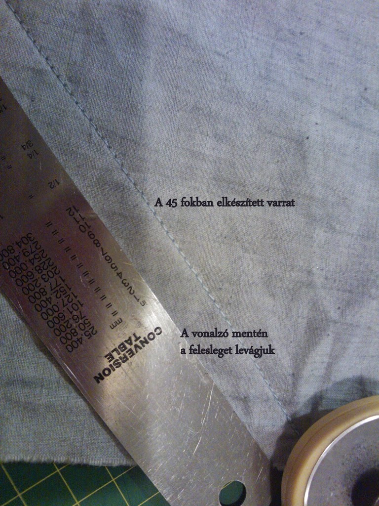 Az egésznek az a lényege, hogy nem szabom előre a 45 fokot, hanem egyenes pántokat varrok mind a négy oldalra, úgy, hogy az első öltést nem a varrat elején, hanem a varrásszélességet kihagyva ejtem.A pántnak mindegyiknek olyan hosszúnak kell lenni, mint a szegendő rész + 2x a szegő szélessége.A munka és a szegő közepét megjelöljük, egyeztetjük és középtől kifelé haladva felvarrjuk a pántot, de a varrat végén a varrásszélességet meghagyjuk a következő sarokban is.Akkor dolgoztunk jól , ha a két varrat egy pontban ér véget, irányuk pont derékszöget alkotva.