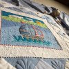 A felhímzett motívumokat aztán, fehér színű, szabad gépi tűzéssel gazdagon díszítettem, a takaró és a párna széle is látványos, hullámos szegélyt kapott, hogy kicsit ellensúlyozzam az applikációs technika egyszerűségét.