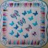 Az aránylag széles keretre, színes gépi hímző cérnával kerültek fel az elmaradhatatlan pillangók. Igyekeztem a tűzés színével hangsúlyozni, az elvárt “fiús-lányos” jelleget úgy, hogy az egyik sarokba kékes árnyalatú pillék, a másikba rózsaszínűeket röptettem.