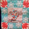 A takarón a középrészeken, az előzőleg felragasztott és gépi pelenkaöltéssel rögzített motívumokat csak kontúr mentén tűztem, hogy megmaradjon a takaró pihe-puha, paplan jellege.