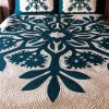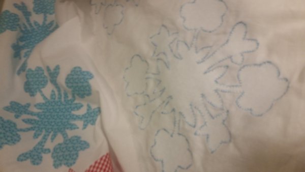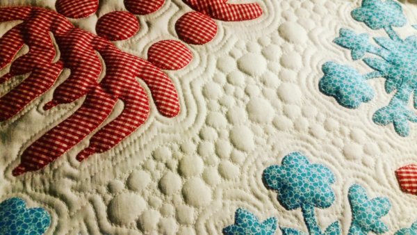A munkát applikációval készítettem el, a formákat gépi pelenkaöltéssel rögzítettem, majd visszhang-tűzéssel domborítottam körülöttük a teret.