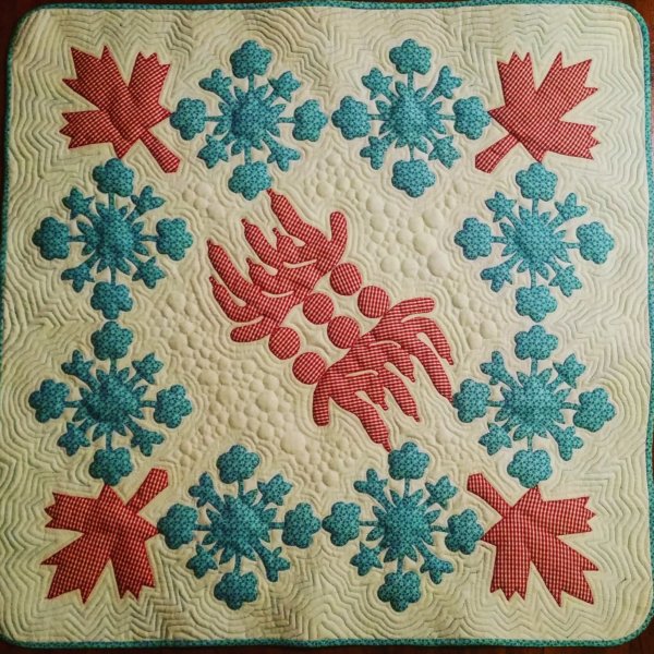Egy olyan babának kellett kitalálnom a születéstakaróját, akinek az anyukájának a kedvenc hawaii mintája: a frangepani virág, az apuka foglalkozása, gyors korcsolya-oktató és az ország ahol élnek, Kanada. A kérés különlegessége abban állt, hogy ennek a sok információnak lehetőség szerint egyszerre, egy helyen kell megjelennie, számomra szerethető formában.