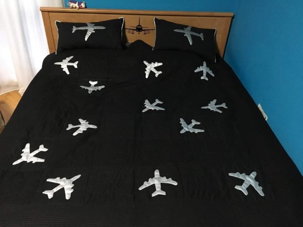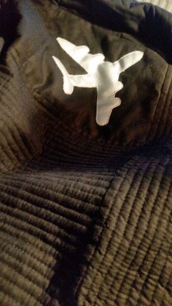 Igen, kicsit szereti a repülőket… amiket műbőrből vagdostam ki ollóval- nem sokat, csak harminchat darabot, logikusan harmincötödik szülinapra… A tűzése csupán a kontúrok mentén, a blokkok árkában és a széleken centinként. Egyszerűen, férfiasan, hogy ne legyen sok.