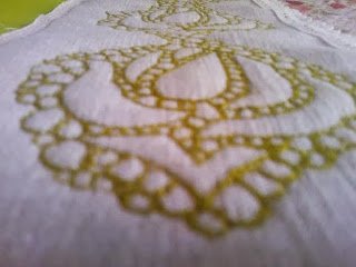 A blokk közepe durva szövésű natúr vászon, még a jófajta békebeliből. Erre kerül az applikáció.Szinte reszketek az izgalomtól, míg készül.Elővadászok a dobozaimból aprócska ollót, inci-finci singert, gyöngyöt, szalagot.