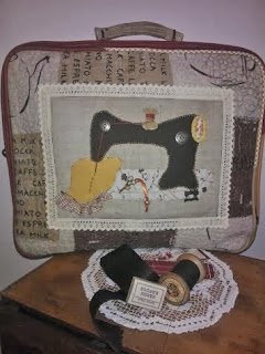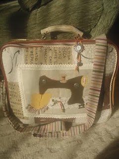 A táska elején egy varrógép virít, az applikáció persze igen alaposan fel van díszítve mindenféle aprócska dologgal,ami még kívánatosabbá teszi egy foltbolond számára.