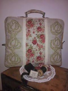Az alkatrészeket kétoldalú ragasztóval rögzítem, majd gépi pelenka öltéssel varrom körbe.A legnagyobb csiniség a spulni, a varrógép tetején,amire vastagabb hímzőcérnával “tekerem fel” lapos öltéssel a cérnát.Az antikolt gombocskákra felhurkolom ,mint az igazi szálvezetőre.A varrógép asztalt is meg kell még kontúrozni, aztán jöhet a keret, amihez egy hasonló struktúrájú és színvilágú anyagot választottam Zárásként egy kis csipkeszalag, mint -képkeret- kötelező.